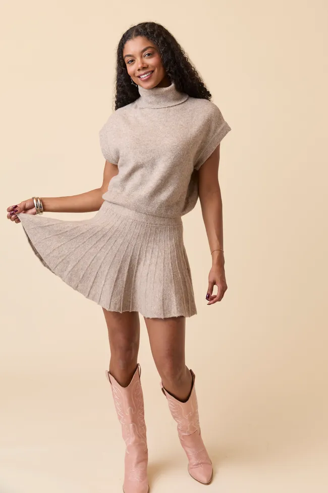 - Top: Sleeveless, ribbed hem, turtleneck